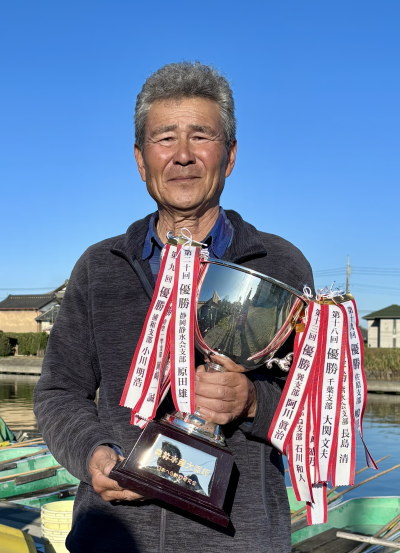 ![]() 農水杯優勝 原田雄一(静岡静水会) 今年最後の行事にして、祭典とも呼ぶべき大会に73名が集う。 中島屋の最終出舟の札を引いた原田雄一(静岡静水会)、下流の水道管へ漕ぎ、旧イリダイの 空いていた所に舟を止め、竿15尺タナ2本のバラグルセット。風と流れが出てからは外通しドボン。 計53枚、10.12キロの正にぶっち切り優勝! 驚きました。ただただお見事でした。